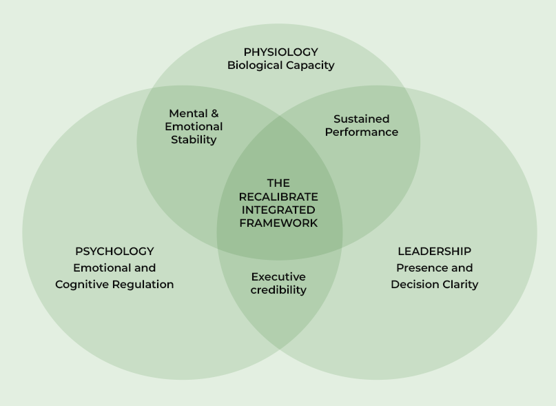 The Recalibrate Integrated Framework aligns physiology, psychology, and leadership to enhance leadership effectiveness through a critical transition